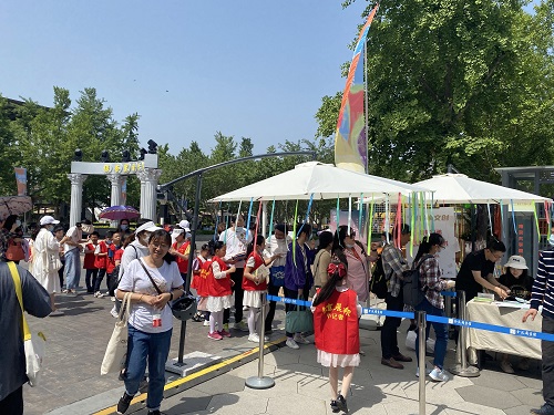 5月9日换书市集当天正值母亲节,金图南门口“南京共享图书馆”信用智能借阅柜旁,前来参与活动的市民读者熙熙攘攘,烈日炎炎也无法阻挡他们的如火热情,其中最为亮眼的便是身着红马甲的南京晨报小记者团,陪着妈妈一早便来到了现场。