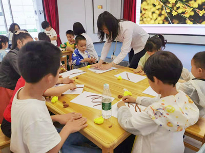 分享完经典的故事,张老师带领小朋友们一起用粘土做迎春花。一双双小手灵活地揉捏着粘土,棕色枝干、金黄色的花瓣、绿色的叶子,一簇簇漂亮的迎春花在纸上绽放。最后,小朋友们带着自己的作品和老师合影留念,孩子们的笑容在迎春花的映衬下格外灿烂。