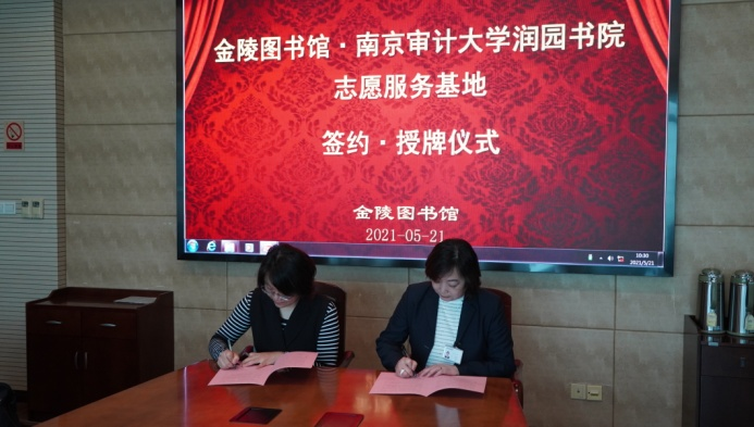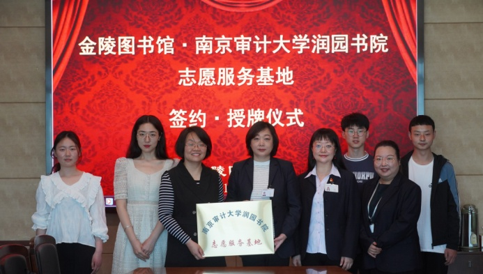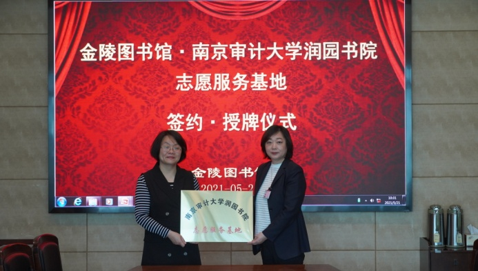 2021年5月21日上午,南京审计大学润园书院党委副书记张巧玲一行5人来到金陵图书馆,与我馆签订了《青年志愿者服务基地共建协议书》,并在我馆举办基地授牌仪式。金陵图书馆杨峥副馆长,活动服务部周樱格主任,代表金图接受了南京审计大学润园书院“志愿服务基地”铜牌并表示感谢。