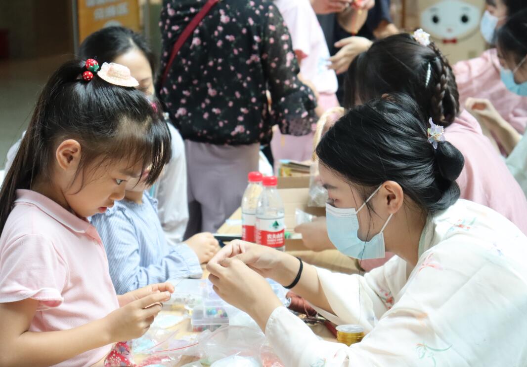 在展台的另一头是手工制作的发簪以及各种小饰品,这些饰品制作精美、新颖别致,深受诸位小朋友的喜爱。小朋友们从中选择自己喜欢的珠串编织到发簪里,将自己制的发簪戴在头上,插入发髻,脸上洋溢着快乐的笑容。