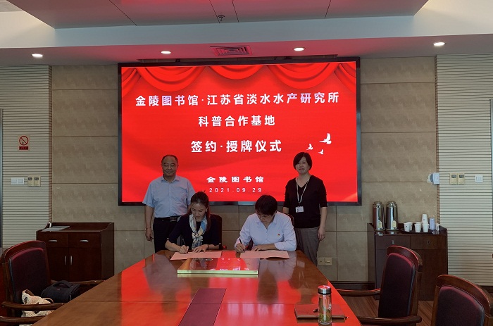 2021年9月29日上午,金陵图书馆副馆长潘洁、分馆建设部主任孙振强代表金陵图书馆就科普基地共建一事与江苏省淡水水产研究所签署《江苏省渔业科普基地共建协议》,江苏省淡水水产研究所总工程师边文冀、办公室主任殷悦等一行4人参与会议。