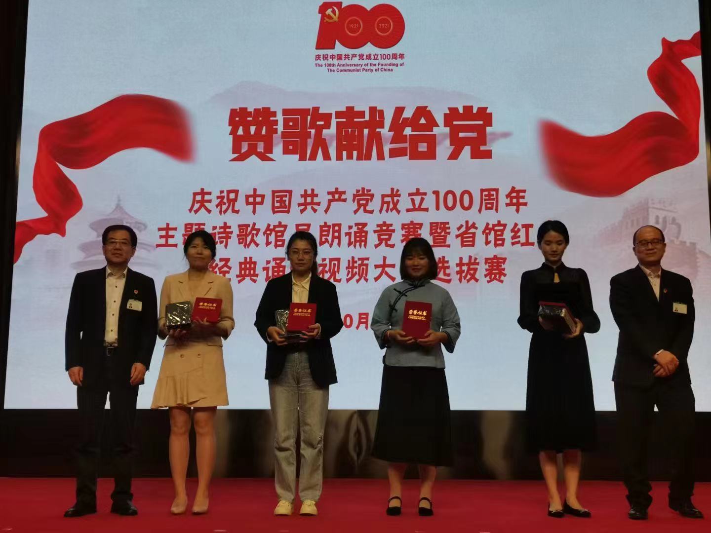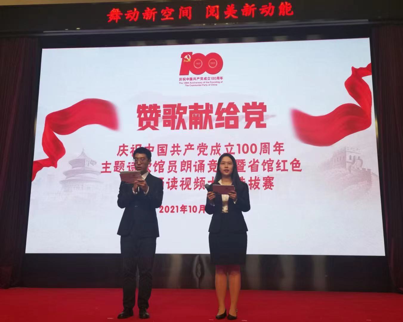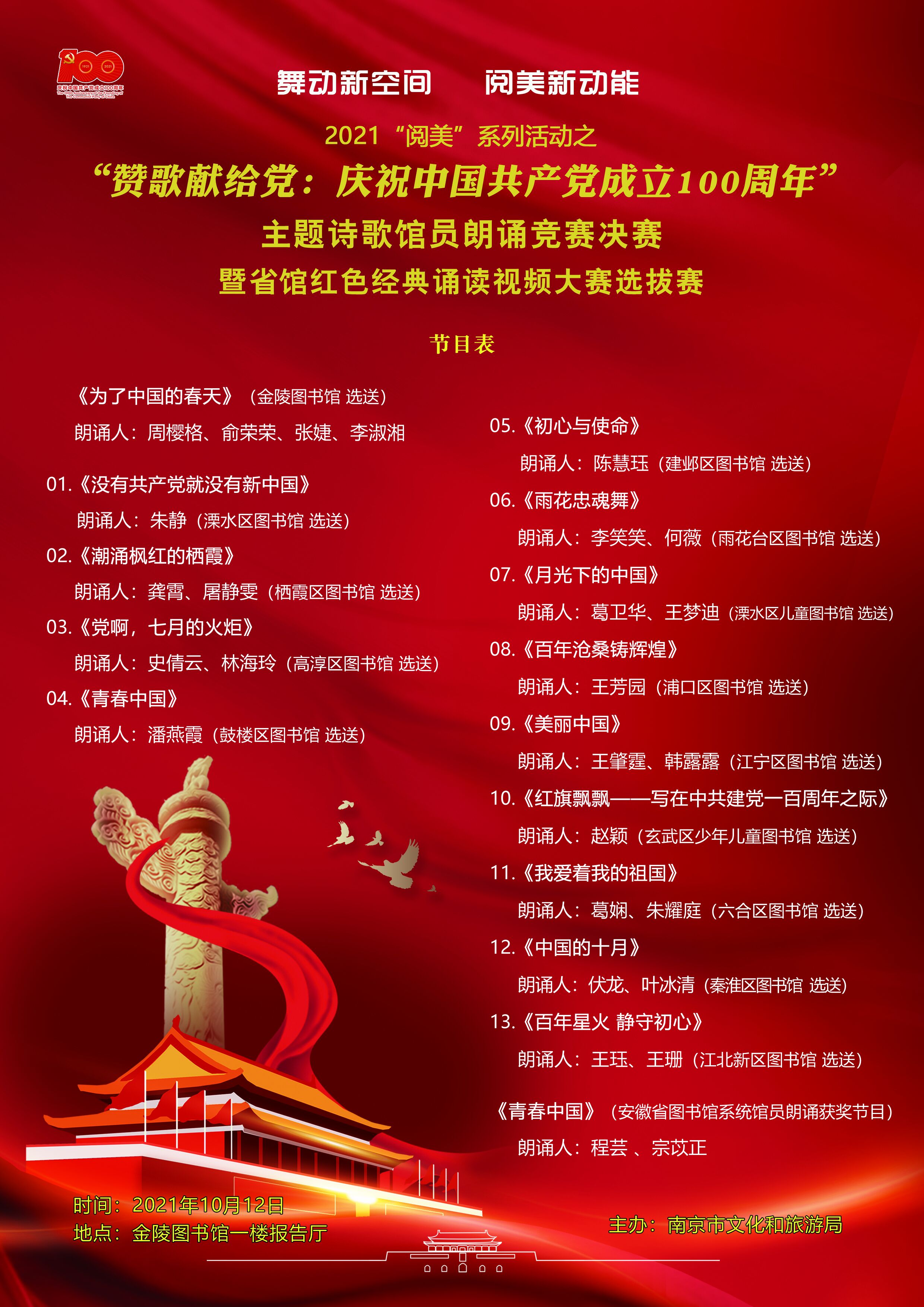 为庆祝中国共产党成立100周年,展现广大图书馆馆员对党的赤诚热情,10月12日下午,2021“阅美”系列活动之“赞歌献给党:庆祝中国共产党成立100周年”主题诗歌馆员朗诵竞赛活动,在金陵图书馆一楼报告厅成功举行了现场决赛。同时,本次竞赛也是江苏省公共图书馆系统红色经典诵读视频大赛的选拔赛。来自南京市各区的十三家公共图书馆员精心准备,向建党100周年献礼。