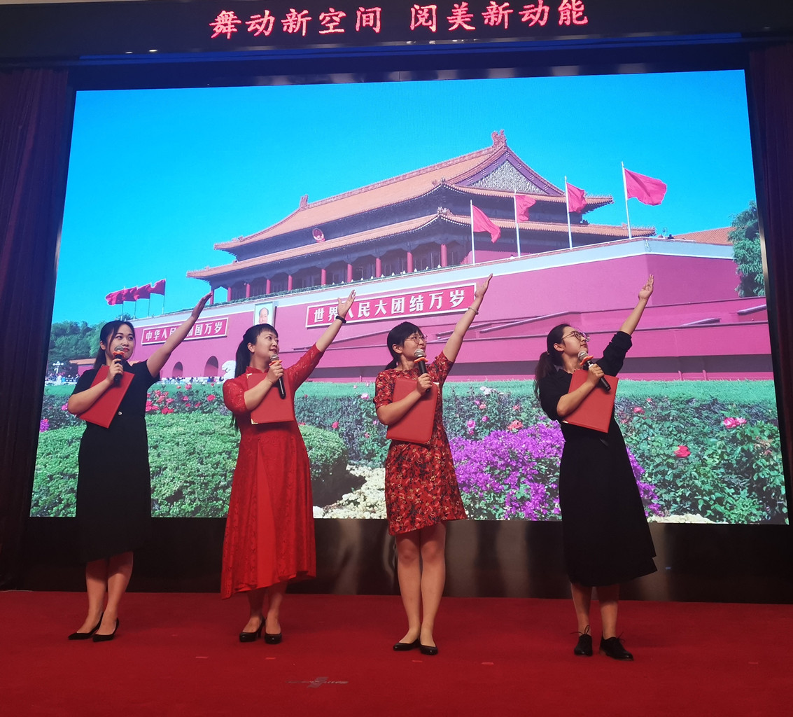首先,全体起立,奏唱国歌。在庄严的国歌声中,在场的每一个人都燃起了爱国热情。竞赛在金陵图书馆馆员带来的暖场诗朗诵表演《为了中国的春天》中拉开序幕。