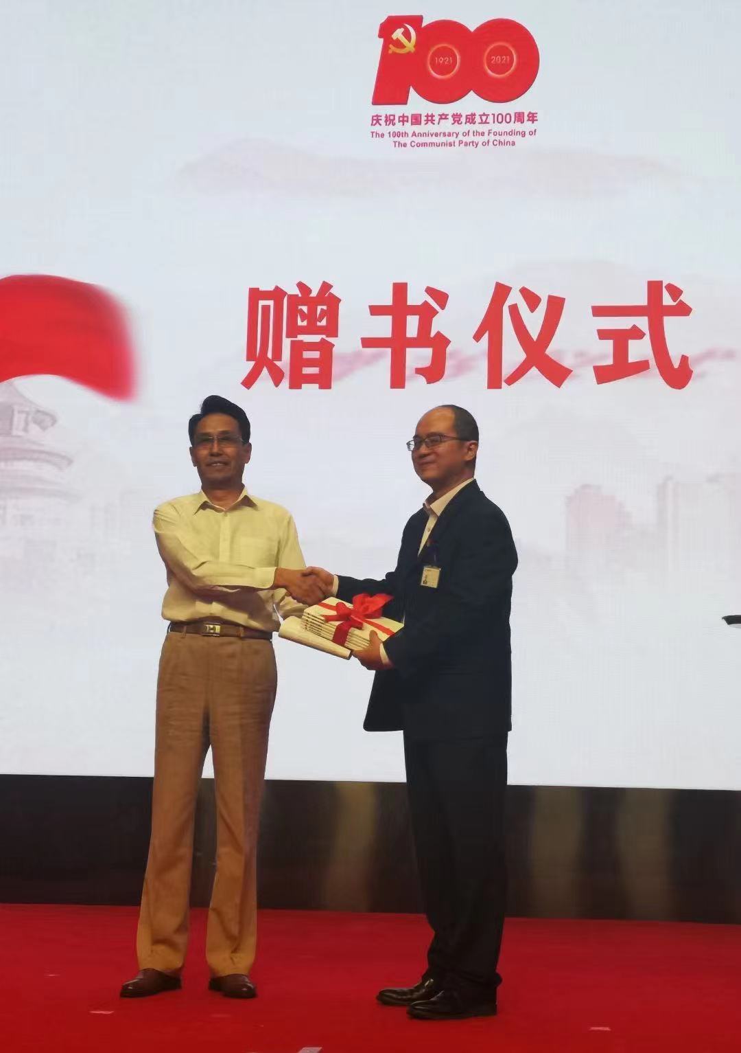 担任竞赛评委之一的南京诗词学会的常务副会长邹俊,是南京电视台第一代播音员,长期从事朗诵艺术的研究、创作。邹俊先生将自己亲笔签名的著作《朗诵艺术通论》赠送给金陵图书馆、南京市各区公共图书馆、马鞍山市图书馆及花山区图书馆。金陵图书馆党总支书记尹士亮作为公共图书馆代表接受赠书。