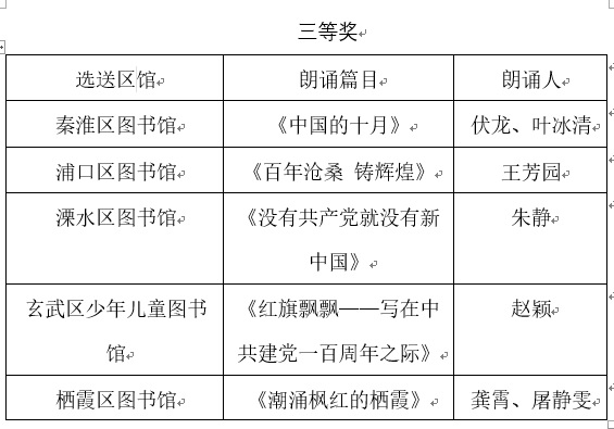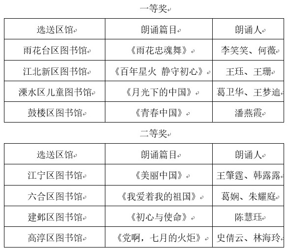 评委们依据朗诵内容、语言表达、形象风度和综合效果等多项标准进行量化打分,其中,雨花台区图书馆与江北新区图书馆并列获得第一名,获奖作品《雨花忠魂舞》《百年星火 静守初心》将和金陵图书馆作品《为了中国的春天》一同选送参加江苏省公共图书馆系统红色经典诵读视频大赛。