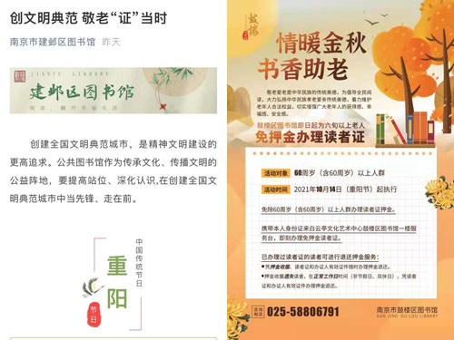 全市各区图书馆积极响应号召,全市联动,设计特色宣传海报,同步发布活动预告,南京市区两级公共图书馆携手同行,共同开展“创文明典范,敬老‘证’当时”活动,用文化惠民行动为市民读者送上真挚的节日祝福。