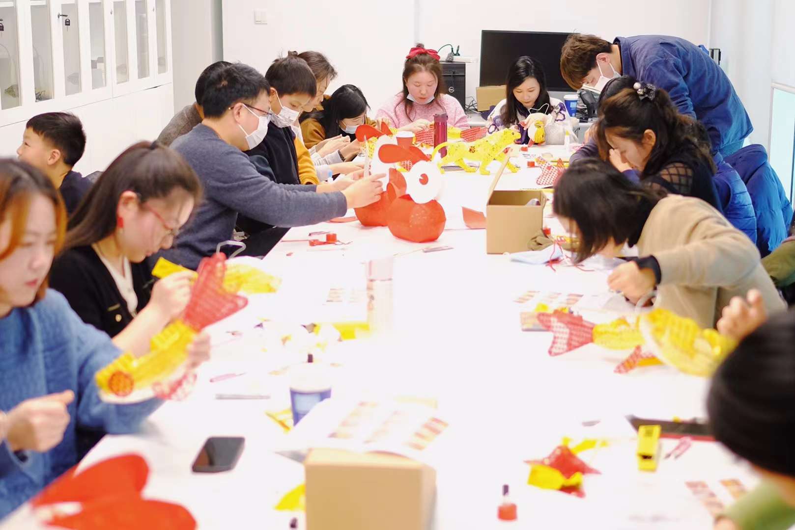 每年的花灯活动,总会有很多家长带着小朋友前来,全家人一起动手。与往年的荷花灯、兔子灯不同,今年金图手工坊为大家准备的是金鱼灯。金鱼灯的不同之处在于鱼身的材质是带着两片的纱质布料,微有弹性,这样在制作难度上会稍有提高,但同时效果也会更好,微弹的布料能绷的更挺括,纱质透光,点上小蜡烛之后整条小金鱼通体晶莹,小亮片仿佛是鱼鳞,栩栩如生。它们带着美好的祝福,带着对新年的祈愿,祝愿大家平安喜乐,上元安康。
