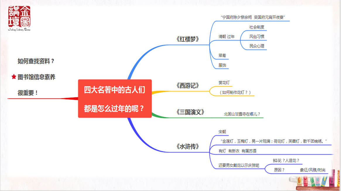 周樱格主任从如何解决“古人是如何过年的”这个问题说起,谈到自己和女儿巧妙的运用四大名著中的叙述和描写来进行信息的删选和综合,最后获得江苏省图书馆学会一等奖的例子说起,生动的诠释了在阅读中巧读、趣读的重要性。接着周主任从信息学的角度,教给同学们一些基本的信息素养知识和实践方法,又从图书馆学的角度给同学们介绍了图书馆学五定律、金陵图书能够提供的信息服务、Z世代青少年的阅读趣味和阅读推荐。整个讲座环节紧凑,内容丰富,给同学们的阅读打开了眼界。