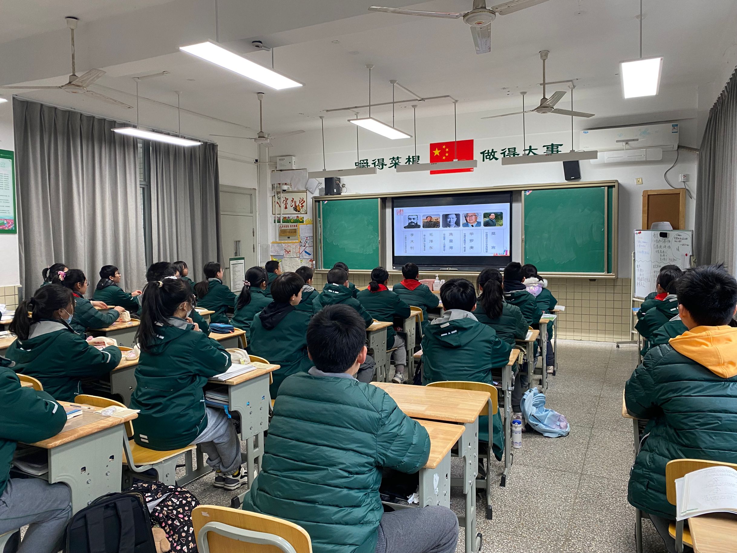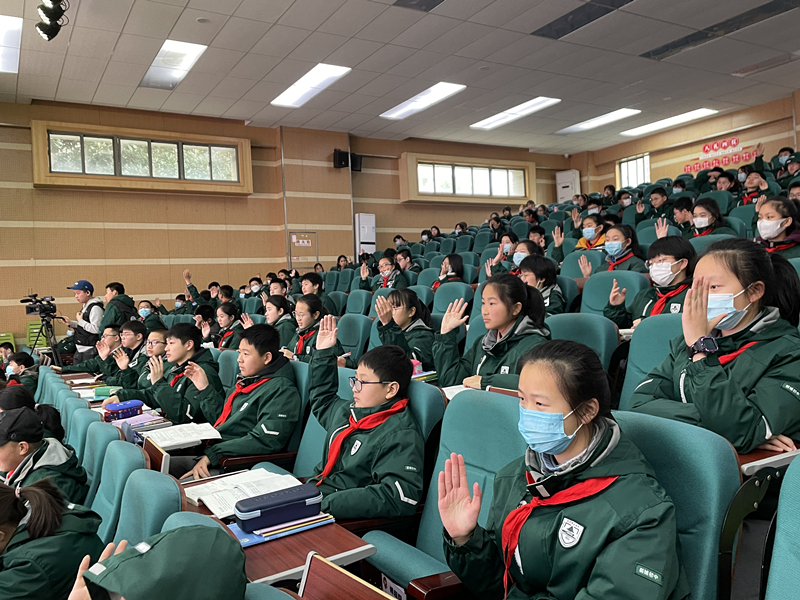 本次讲座依照防疫要求,采用主会场+分会场同时进行的方式。148名同学佩戴口罩隔位就坐在报告厅聆听讲座,其余初一初二一千二百余名同学在分会场收看同步传导。