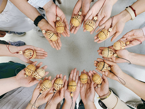 一下午的时光,大家的双手都被需要时不时泡一泡水的竹篾弄得皱巴巴,但是看到那一只只已经挂在包上的竹编香囊,这个端午,也是让人从心里微微的发出微笑的我们节日呢。