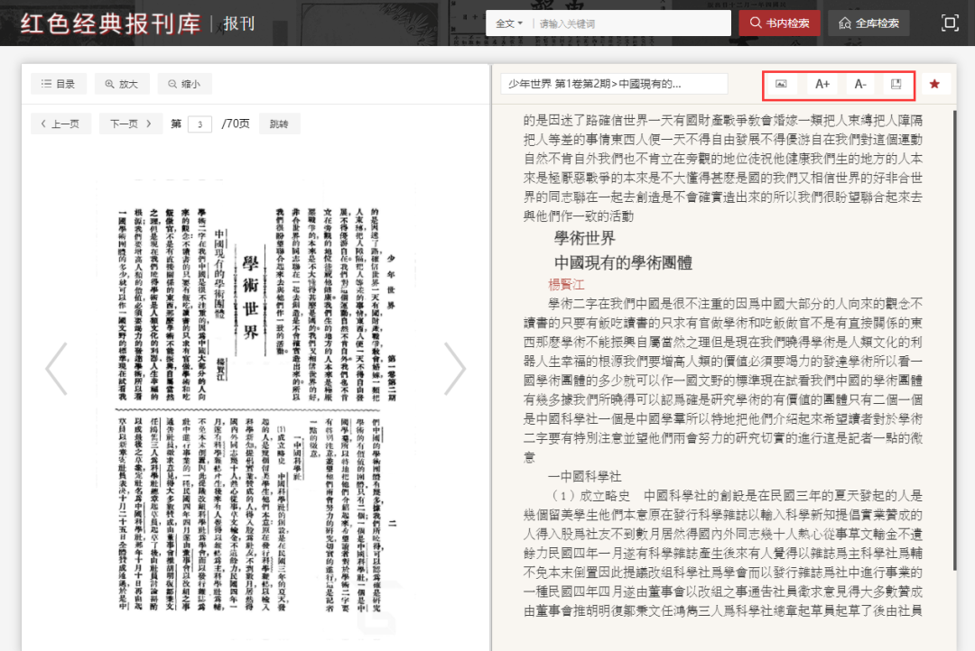 《红色经典报刊库》内容丰富,文本优质,能够充分保证检索的有效性;检索结果可以精确定位到对应页面;阅读界面充分考虑用户需求,左图右文,对照清晰,支持在线复制引用;同时还提供多种个性化功能,为用户研究提供便利。总结起来,主要有以下几方面特点: