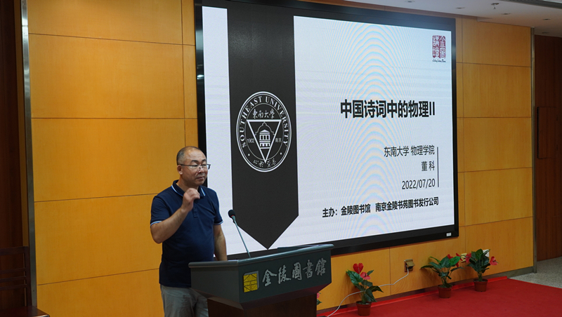 物理学是研究物质最一般的运动规律和物质基本结构的学科。大至宇宙世界、小至基本粒子,都是物理学的研究对象。作为历史悠久、文明璀璨的大国,中国的传统典籍早已记载了先贤对物理学的探索。2022年7月20日上午,金陵图书馆诚邀东南大学物理学院副教授董科老师主讲“金图讲坛”《中国诗词中的物理》,与读者们共同探索大千世界的神奇奥妙。