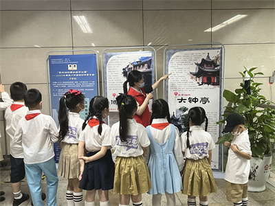 启动仪式结束后,小朋友们参观了南京世界文学客厅,近距离感受古都文韵。随后,南京地铁工作人员带领小朋友从南京城市安全文化主题车站——鸡鸣寺站,乘车到鼓楼站,对鼓楼站文化走廊中的百年恰似最芳华史料图片展、南京云锦、明城墙·城砖铭文等进行了讲解。金陵图书馆朗读志愿者还为小朋友介绍了“大钟亭”、“傅抱石故居”文学地标内容,并讲述这些地方所发生的历史故事。最后,小朋友参观了地铁车控室,实地了解车站现场设备控制方面的小知识。
