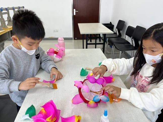 秦淮灯彩样式众多、工艺复杂,鉴于孩子们都是第一次接触,课程选取制作秦淮灯彩中较为基础,同时也非常具有代表性的——莲花灯。制作莲花灯首先需准备以下材料:花托、花瓣、荷叶、灯杆、电子灯、白乳胶等。莲花灯的制作并不复杂,第一步需要先粘贴第一层花瓣,在红色的塑料薄膜下约两个手指的宽度的位置用白乳胶粘贴;第二步在每两个花瓣下约一指宽度的位置粘贴后面并以此类推;第三步,在粘贴完三层花瓣之后,将绿色的荷叶粘贴在花瓣之下;最后放入电子灯,挂上流苏和灯杆整个莲花灯就算大功告成了。在制作过程中,因为简单易学,小朋友们上手非常快,最后都出色地完成了花灯制作。