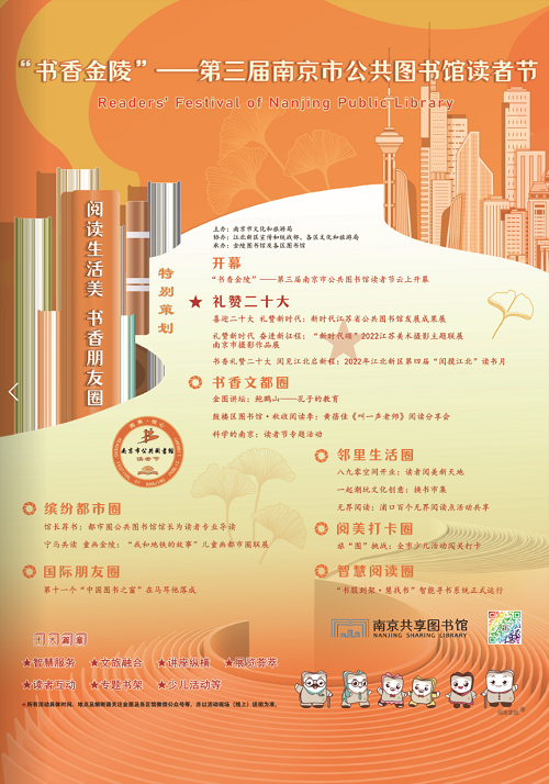近年来,南京共享图书馆以南京成为“世界文学之都”为契机,推进文旅深度融合,打造符合智慧阅读需求的服务场景,提升公共图书馆场馆服务能力,不断提升市民读者公共文化服务满意度。此次读者节前后,市区联动共策划有“讲座纵横”“展览荟萃”“智慧服务”“文旅融合”等10大篇章,以及110余场集创新、互动、智能、便民等为一体的文化活动与服务,以全市14家公共图书馆为阵地,线上线下开展,期待全市读者参与。