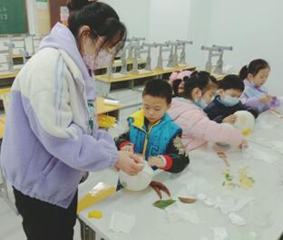 花草纸灯的制作步骤并不复杂。首先是吹气球,这一环节也是整个制作过程中最令小朋友们激动的。大家个个拿起气球嘟着嘴给气球吹气,气球的大小没有特别的规定,但考虑到后面的制作,老师要求孩子们把气球控制在直径15厘米左右。第二步需要用到刷子和纸了,这一步所用到的纸是一整张,不需要分层,撕成大小不一的形状,然后用清水将纸一层层的刷在气球上面,这么做也是便于后期好脱模。第三步是用制作好的,按照白乳胶与水一比一混合胶水进行第二层刷纸,这里需要注意的是,纸需要一分为二。第四步,是上纸的最后一层,小朋友可以根据自己的喜好拿花草对纸灯进行装饰,在花瓣叶片的位置刷一层纸,可以使其更好的固定住,随后便是等待晾干。最后,待纸完全干透后,用尖锐的物品将气球扎破,并修剪多余的边角,再打上孔,穿上麻绳与木棍,最后放上灯串,一个小巧精致的花草纸灯便完成了。