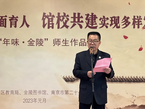 随后金陵图书馆馆长焦翔致辞,并代表主办方对参加本次活动的广大师生表示了诚挚的问候。焦馆表示,为推进全民阅读与文化教育的有机融合,加强未成年人思想道德建设,切实助力“双减”工作,从去年年初开始,我馆向二十七中校园输送了一系列特色活动,如科普讲座、“金图手工坊”纸藤编织、读书交流会等,获得了良好的反响。此次作品展充分体现了“馆校共建”机制的生机与活力,立足于图书馆的资源优势,为同学们提供多样化、便利性的知识服务,培养了同学们对图书馆与阅读、对南京历史与特色文化的热情与喜爱,预祝此次作品展圆满成功。在热闹祥和的气氛中,许局长宣布作品展开幕。