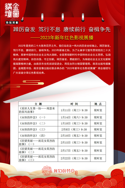 2022年是党的二十大胜利召开之年,我们站在这一伟大的历史坐标轴上,踔厉奋发,笃行不怠,赓续前行,奋楫争先。2023年新春之际,为了认真学习宣传贯彻党的二十大精神,高举中国特色社会主义伟大旗帜,全面贯彻新时代中国特色社会主义思想,弘扬伟大建党精神,自信自强、守正创新,踔厉奋发、勇毅前行,为铸就社会主义文化新辉煌凝聚精神力量,由南京市全民阅读促进会、雨花台烈士陵园管理局、南京出版传媒集团、金陵图书馆、南京音像出版社联合举办的“2023年新年红色影视展播”在1月11日—2月22日继续与广大读者分享红色影视经典。