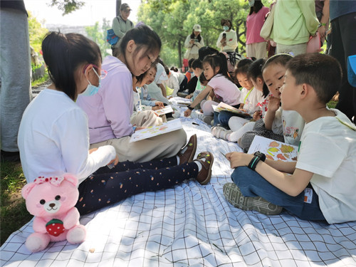 在鸟语花香的5月,老师们带领孩子们来到满是绿植花卉的古林公园。首先,在一片绿荫下,开展草坪共读。本次选取的共读绘本是《100只蚂蚁,100片树叶》,讲述了100只蚂蚁各自搬着大小、形状、颜色都不一样的100片树叶去装饰晚会场地的故事。老师通过领读、轮读、分角色朗读等形式,围绕绘本中100种不同的树叶来引导孩子观察大自然,培养孩子的观察力和创造力,感悟大自然之美的同时,还能轻松又快乐地进行数学启蒙。