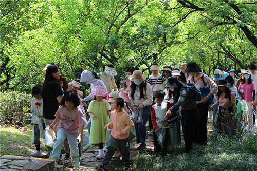 接着,身临其境地观察和探索自然。老师带领孩子在公园一边徒步,一边观察沿途桂花树、水杉叶、五彩苏等树叶的形状、特点,介绍植物的光合作用和呼吸作用,讲解关于它们的小故事。比如,水杉是一种很稀有的古老生物,我国一级保护植物,植物王国的活化石,跟1亿年前的恐龙在同一个时代;讲到五彩苏,联系到母亲节,说它不仅叶子外观很漂亮,而且它的提取物有消除皱纹,抑制黑色素和抗衰老的药用作用,以此引导孩子们深入思考,启发孩子对自然的兴趣。
