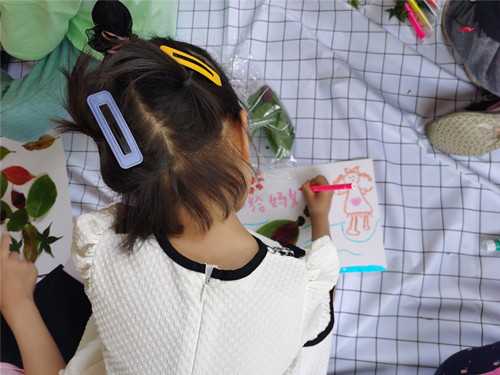 最后,开展手工实践,制作创意树叶拼贴画。在徒步中,孩子们也都带上了与绘本故事里小蚂蚁“收集100片不同的树叶”同样的任务,每个人都收集到许多形状各异的落叶,汇聚在公园里的一角凉亭,开始制作自己的创意拼贴作品。孩子们充分发挥出各自的想象力和创意力,有的创作出一片小森林,有的绘制出一个游乐场,而相同的是,他们都在画作中融入了自己对妈妈最纯真的爱。