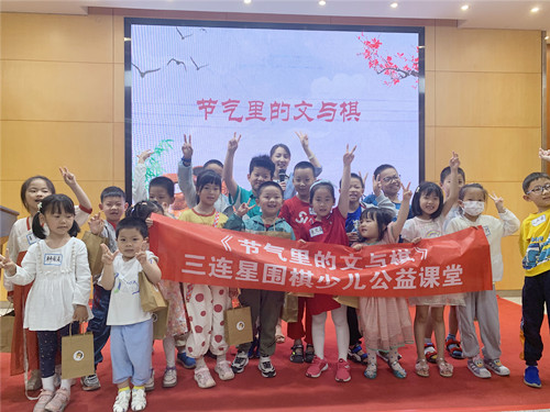 第一课时,主讲老师结合节气“小满”, 由蚕的生长引出围棋的“生长”,概括性地向小读者们介绍了小尖、小飞、大飞、超大飞等行棋方法。第二课,主讲老师以节气“芒种”的习俗开篇,用芒种送花神的习俗引出围棋中的“花”——花五,通过一番讲解、演示,课堂上的小读者们都将“花五的要点在花心,自己点做活,对手点一点死”口诀牢记于心。指导老师又借用孩子们非常熟悉的奥特曼打怪兽情节,向现场许多围棋零基础的小读者形象地介绍了围棋中“气”的概念。对手的棋子就是怪兽,气就是怪兽发出的信号,中断这些信号就能打败这只怪兽。形象生动的讲解让小读者们立刻找到切断信号的位置,中间的棋子有四口气,边上的棋子有三口气,角上的棋子有两口气,一只只怪兽败在了大家的手上。最后,主讲老师向每位参与活动的小读者赠送了一份神秘礼物——迷你围棋,孩子们带着对芒种节气习俗的认知、对围棋这一古老游戏的浓厚兴趣与主讲老师一起合影留念。