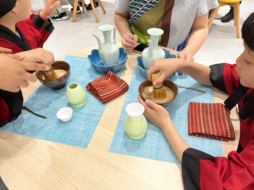 在黑暗体验结束后,我们进入了点茶的环节,老师带领小朋友从茶的起源讲起,认识了茶具与茶艺。中国是茶的故乡,也是茶文化的发源地,它的发现和利用已有四千七百多年的历史,是人们日常饮品,发展至今也拥有属于它自己的文化体系。饮茶文化自唐代繁盛,品茶、论茶也成为一时风尚,宋朝形成了豪华极致的宫廷茶文化,又在民间兴起了趣味盎然的市民茶文化,饮茶成为宋人四雅之一。本期课程中,小朋友跟随老师,一起学习了七汤点茶法、茶百戏,共同体会了茶的魅力。