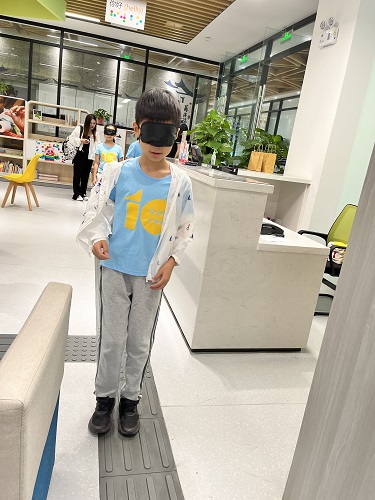 活动开始前,我们带领小朋友们参观了视障阅览室,讲解盲文书的构成与使用,小朋友们亲手体验了如何识别盲文,以及盲文写字板如何书写。在铺设盲道的阅览室内,小朋友们带上眼罩,在磕磕绊绊间共同探索阅览室,在黑暗中寻找正确的道路。体验环节中,小朋友纷纷表示,视力障碍时的学习与生活十分艰难,要尊重爱护视力障碍群体,也要好好保护自己的视力。