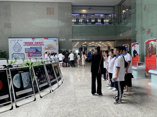 随后,研学团队沿着金图馆员提前精心设计好的参观路线,跟随带队老师分组开始了有序且充满活力的参观。穿过长长的“展览通道”,内容丰富的海报展、画作展为参观团带来一场从视觉到精神的盛宴。通过图文并茂的展览这一具象化的模式,知识不再是抽象化的叙述,更是触手可及的艺术。紧接着,馆员们带领研学团队来到了图书借阅室和阅·荐空间,向他们讲述了图书分类法这一图书馆学专业知识,介绍了金图新型的“慧找书”机器人。在这里,琳琅满目的书籍摆放得错落有致,馆藏丰富,古今中外,集精撷萃。书架之间还专门设置了休息区,读者们在这里面朝窗外的碧波荡漾,心系书中的万千世界,温馨而舒适。
