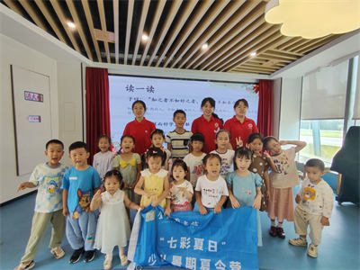 2023年8月7日上午,“七彩夏日”少儿暑期夏令营之红蜻蜓国学堂和小朋友们准时相约金陵图书馆少儿低幼绘本区,来自南京晓庄学院的志愿者老师为小朋友们解读国学名著《论语》。