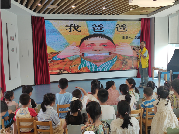 本场活动中,南京晓庄学院的主讲老师为孩子们带来了绘本作品《我爸爸》。这本书从孩子的视角讲述了勇敢又温柔的爸爸,在孩子的眼中爸爸什么都会,无比地崇拜爸爸,爸爸像温暖的太阳一样,呵护着孩子的成长。从小到大,爸爸便是我们心中的超级英雄,在主讲老师的带领下,孩子们通过《我爸爸》这本书,以不同的视角领略了爸爸的威武,也在这个过程中体会到了父爱的伟大。同时,在分享环节,孩子们也都纷纷描述了在自己心中,爸爸的形象是怎样的。