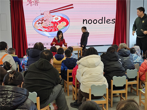 为了让小朋友们更好地了解中国传统节日的习俗,本期小水滴英文读书会,老师特别挑选了以新年为主题的英文绘本《The Nian Monster》,希望以绘本故事为情感纽带,激发孩子们对传统文化的热爱。活动开始,老师就播放了一段动画视频,视频中的年兽样貌凶恶,张着血盆大口,在除夕之夜,新春来临之际,准备吞噬上海!精彩刺激的短片吸引了小朋友的注意力,大家紧张地瞪大眼睛,全神贯注地盯着老师,迫不及待地想知道故事的进展。为了让绘本解读更加生动,老师拿出了年兽的面罩,戴在自己的头上,瞬间,老师变成了“年兽”,小朋友们犹如身临其境般地置身于故事中,一起开动智慧的脑筋,纷纷想出了各种方法,和“年兽”斗智斗勇。有的说放鞭炮吓走它;有的提议趁着年兽睡着之际,把它绑起来,扔进河里;有的小朋友甚至天马行空地想象着如何把年兽关进监狱!稚嫩的童言童语引得全场忍俊不禁。当小朋友们知道聪明的小主人公计划用全上海最好吃的美食把年兽喂饱,趁着邀请年兽看烟火表演之际,点燃它身后的爆竹,让它永远地消失在遥远的天边时,大家忍不住哈哈大笑起来!绘本解读过程中,老师用表演舞台剧的方式,和小朋友们一起还原了故事中最精彩的情节。游戏环节,老师带着小朋友们一起手工制作了绘本中的美食,大家一起做面条、打米糕、搓汤圆,玩得不亦乐乎!在寓教于乐中,小朋友们轻松掌握了绘本中关于美食的主题单词和句型。活动最后,老师唱着新年歌曲,并为孩子送上最诚挚的新年祝福,现场气氛温馨欢乐。