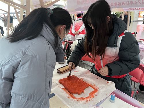中建铁投集团华东公司为旅客赠送图书,让书香伴旅客同行。直播带货主播正对着手机屏幕向广大网友推介房县香菇、恩施腊味、秭归脐橙等乡村振兴特色农产品,吸引旅客驻足关注、选购下单。新文艺青年为旅客带来魔术、滑稽小丑等精彩的节目表演,以及窗花剪纸、木版年画、糖画制作、等传统文化体验项目,其中我馆的青年馆员葛瑶和钟婧茹两位同志也代表金陵图书馆积极响应团市委号召,带去了金图手工坊的扭扭棒手工制作以及雕版印刷体验,让旅客感受到传统文化的独特魅力。江苏省中医院、南京市中医院、南京市口腔医院为旅客提供健康义诊、节日饮食宣讲,让美食与健康相伴。中国移动江苏公司展示了5G新通话、5G高清互动直播、移动云VR、超级手机卡等新技术设备,让旅客体验到科技魅力。主办方现场视频连线在苏州、徐州高铁站的青年志愿者代表,了解春运志愿服务情况。