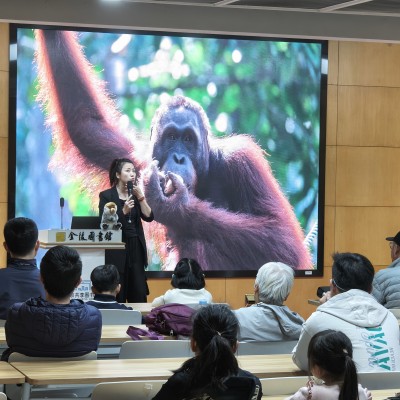 婆罗洲,即加里曼丹岛,是亚洲最大的岛屿,拥有丰富的自然资源、独特的文化和悠久的历史,拥有无数美丽而神秘的生物和自然奇观,是自然记录片拍摄最多的地区之一。张燕宁老师曾多次带队探访婆罗洲,拍摄了大量珍贵的照片和视频。此次讲座中,张老师用生动幽默的语言,分享着一张张照片背后的故事:红毛猩猩、大王花、长鼻猴……众多岛上特有的动植物吸引了到场的50余位大小读者的目光,张老师还不时用问答的形式和小朋友们互动,讲座的气氛热烈而活跃。