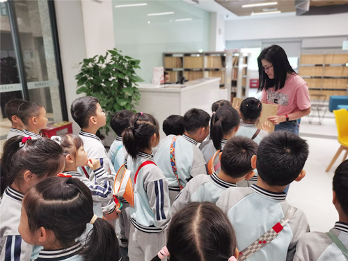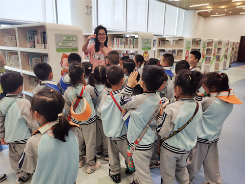 活动开始后,孩子们跟随着葛老师的指引,分别有序地参观了图书馆一楼部分区域:大厅景观“智慧的水滴”、图书借阅室、视障人士阅览室以及童·阅空间。