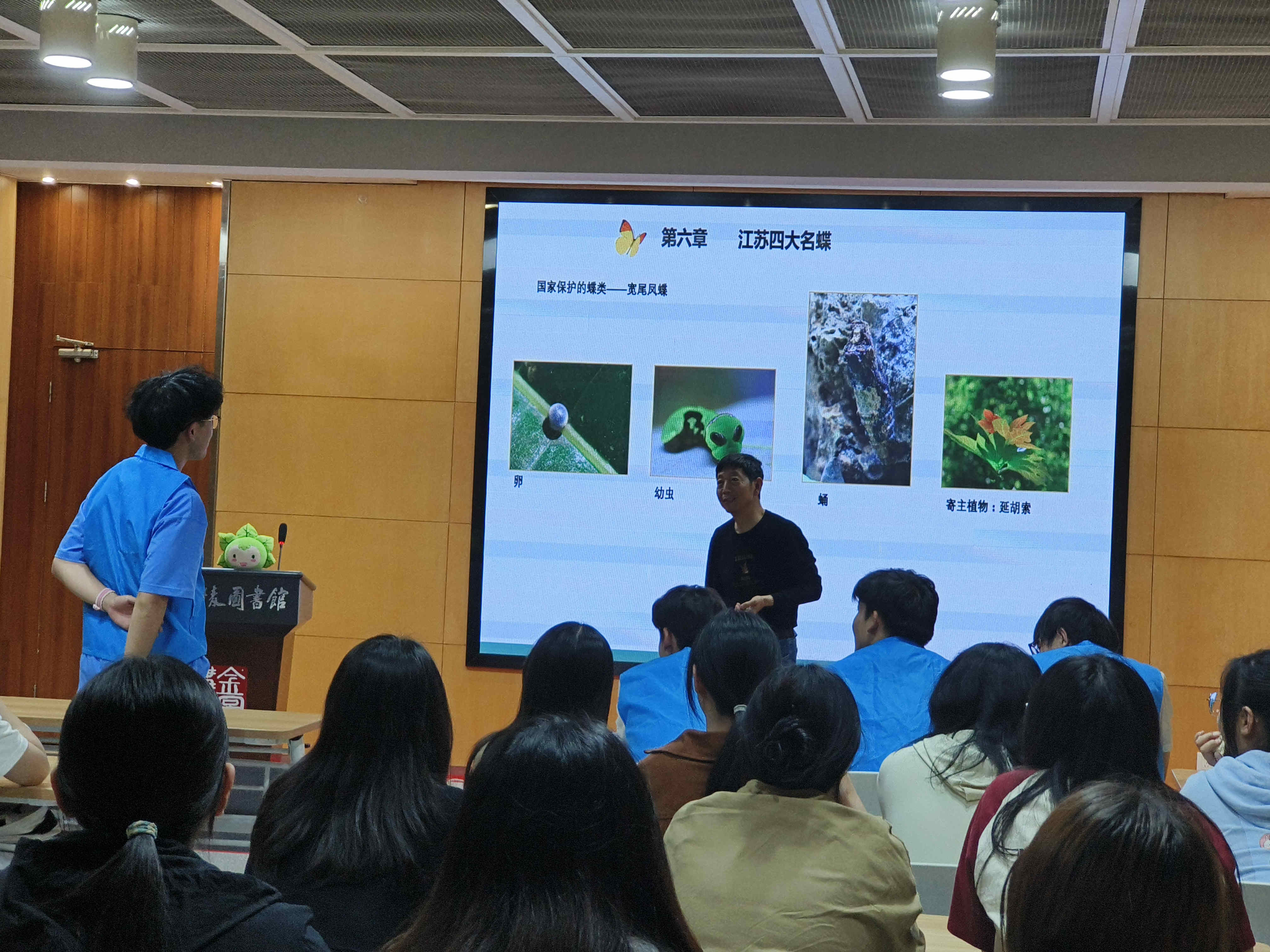 张老师深入浅出地讲解了蝴蝶的相关知识,并重点讲述了世界“十大国蝶”、中国国家一级和二级保护蝶类,以及江苏四大名蝶等。最后,张老师还向大家展示了相关艺术作品。