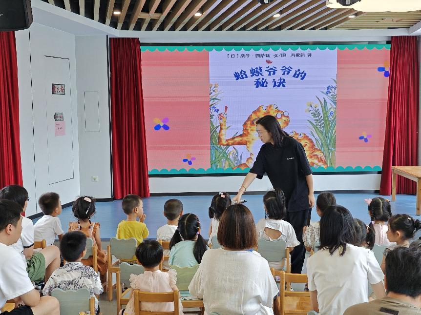 活动开始后,在薛老师的生动讲解下,孩子们逐渐沉浸在了《蛤蟆爷爷的秘诀》的故事中。绘本通过一系列精彩的故事,展现了蛤蟆爷爷如何运用他的生活经验和智慧,帮助孙子解决各种难题。这些故事不仅充满了幽默和趣味,更蕴含着深刻的教育意义,教导孩子们学会独立思考,勇敢面对生活中的挑战。