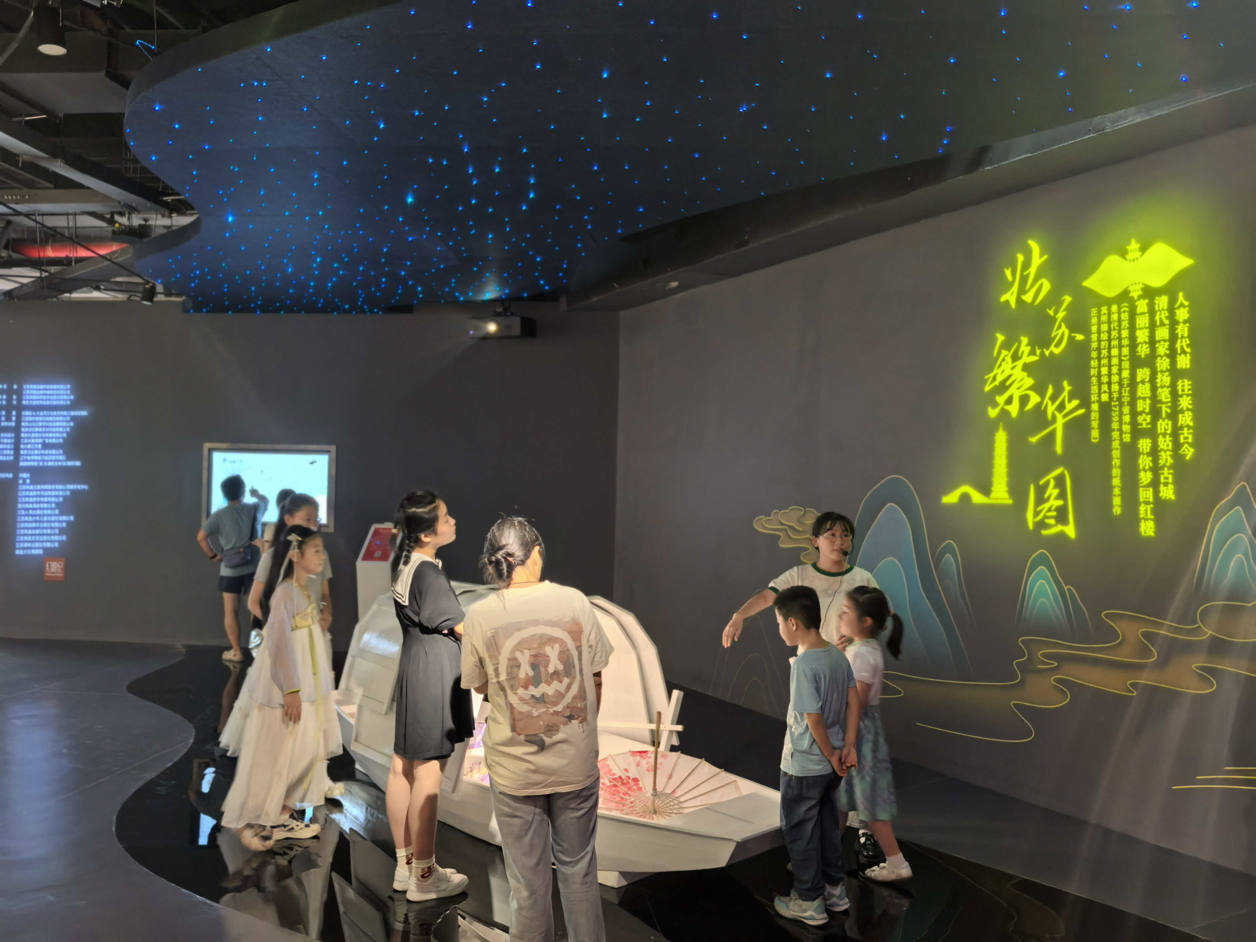 凤凰出版传媒集团李玲玉老师先带领小朋友们参观了光影艺术展,从元妃省亲、共读西厢、到宝钗扑蝶、黛玉葬花,李老师给小朋友们详细讲解了数字展览背后的故事。沉浸式交互技术,让小朋友们穿越时光,与书中人物互动。除了红楼故事,展览还梳理《红楼梦》中的大运河文化元素。在展览现场还可以一睹古画《姑苏繁华图》复活、聆听国家一级演员单雯演绎《牡丹亭》唱段。接着,李老师带领小朋友进行了投壶比赛和击鼓传花,接到花的小朋友需要背诵一句带有植物的诗句。