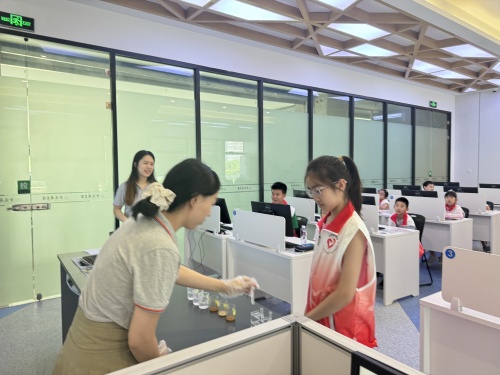 在实验环节后,小朋友们体验到了图书馆的雕版印刷,并在老师的指导下得到金陵图书馆限定的“科学的南京”logo,体验雕版印刷的乐趣。