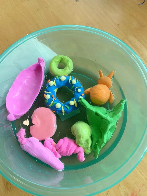 在实验环节,大家的积极性被充分激发出来,彩色黏土被捏成了饺子、包子、毛毛虫、甜甜圈、兔子、小船、海龟等等。很快,每张桌上的塑料盆里就漂满了黏土制品。主讲老师问大家:如果将一个黏土制品分成两半放入水中,是沉还是浮?如果将两个黏土制品合在一起放入水中,是沉还是浮?通过一番实践,大家得出结论:同一种材料构成的物体,把它的重量和体积改变,在水中的沉浮状态是不会发生改变的。由此,本次活动的核心概念被引出:真正决定物体沉浮的,是物体本身的材料密度与水的密度之间的关系。当物体材料的密度小于水的密度时,物体会浮在水面上;反之,则会沉入水中。