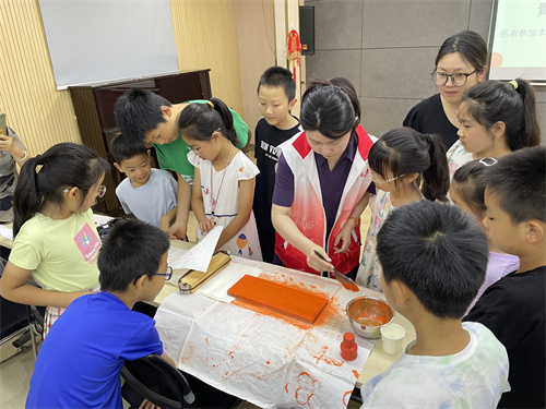 8月14日上午9:30在玄武区红山公园社区,我馆钟老师带领社区的孩子们零距离解密了古籍雕版印刷。雕版印刷术是一种具有突出价值且民族特征鲜明、传统技艺高度集中的人类非物质文化遗产,在印刷史上有“活化石”之称,迄今已有1300多年的历史。当天,孩子们跟随着老师的步伐,深入了解并学习这个凝聚着中国造纸术、制墨术、雕刻术、摹拓术等几种优秀技法的中国传统工艺。在授课过程中,钟老师老师将传统技艺与现代社会相融合,展现了中国优秀传统文化,并且现场展示了实物雕刻印刷板与其操作过程,让小朋友们也同时深刻体会到了这门传统技艺的精髓。