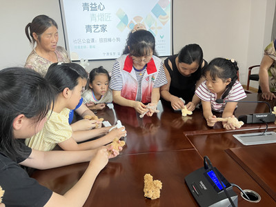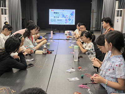 在莫愁湖街道兆园社区的课程内容是扭扭棒醒狮,在制作过程中需要用到热熔胶枪,且对立体塑性有一定的要求,在课程开始之前我们就先将需要家长制作的部分——使用热熔胶枪,和小朋友制作的部分——制作眼睛和装饰物都分配好。这不仅是考虑到亲子活动需要有家长和小朋友的合作,更是考虑到要在最大程度上保证小朋友的安全。永宁街道东葛社区的扭扭棒小狗课程,大部分都可以由小朋友独立完成,只有在细节处需要家长帮助调整,最后为小狗粘贴五官的时候,小朋友和家长一起调整眼睛的位置,小心翼翼的粘上小狗的鼻子,课堂气氛欢快又温馨。双闸街道在八月开展了两场手工课——中国结书签和手鞠挂件。这都是较为精细的手工,不仅对小朋友,对家长也是一场细心和耐心的考验。在这两场手工课上,都有爸爸带着小朋友前来参加的,与以往的“爸爸总是比较粗心”的刻板印象不同,在这两次课程中,爸爸们不仅手工上细致,对待小朋友也很耐心,最后的作品完成度也是数一数二。