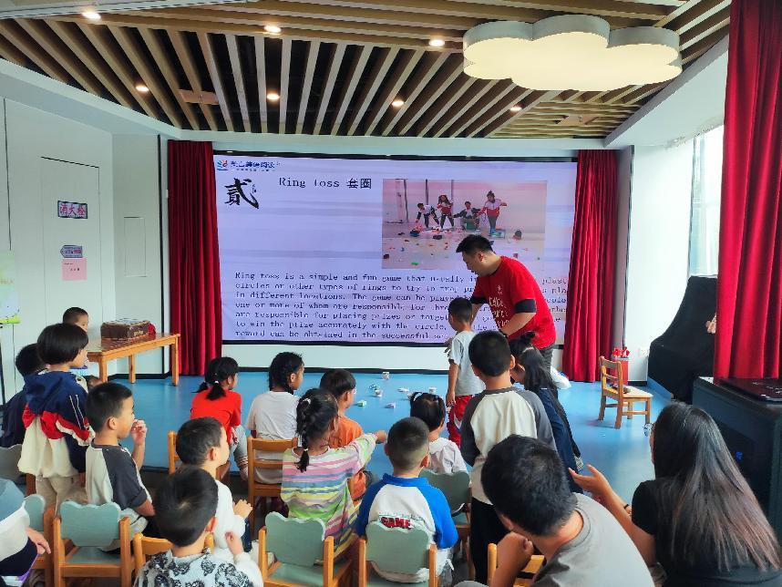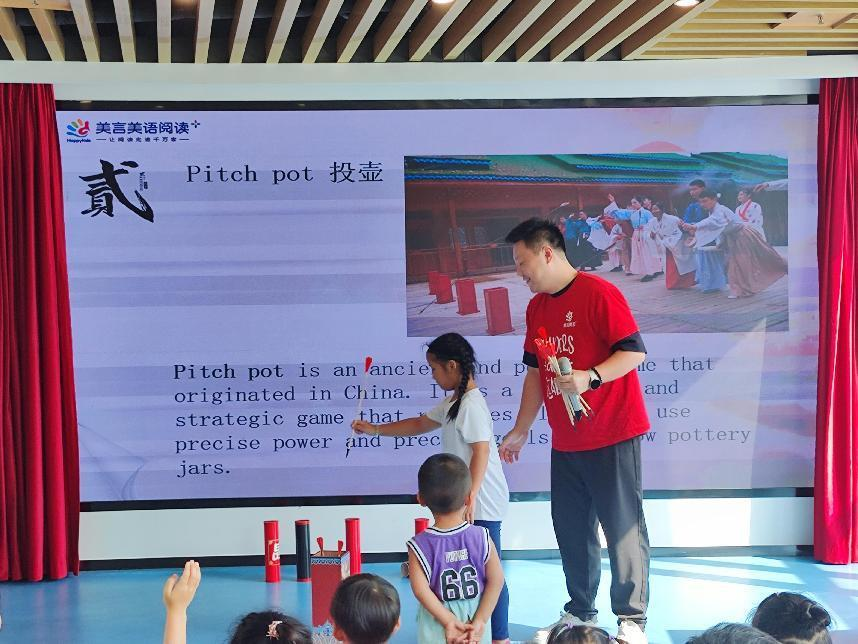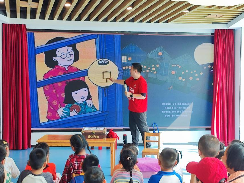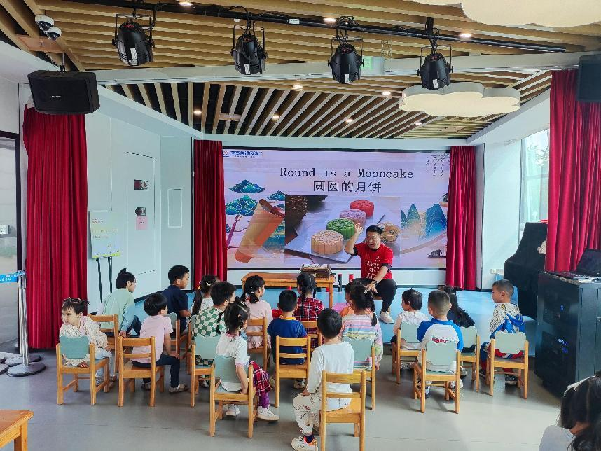 活动开始,老师通过展示精美的月饼图片,为小朋友们生动地介绍了月饼的起源、种类和口味。紧接着,老师变魔术般地拿出一系列形状各异的道具,包括三角形、圆形、正方形、长方形等,引导小朋友们学习关于形状的英文单词。为了让孩子轻松掌握所学的知识,老师精心设计了有趣的小游戏,例如,利用一只红色的小狗玩偶,引导小朋友们找出不同形状的道具。在寓教于乐中,小朋友们很快记住了今天的主题单词。共读绘本环节更是精彩纷呈,本期活动的主题绘本《Round Is a Cake》以生动的图画和简洁的文字,为小朋友们讲述了关于形状和节日的有趣故事,老师用丰富的肢体动作,引导孩子们在故事中感受节日的欢乐与形状的魅力。在老师精彩的演绎下,小朋友们听得津津有味,不时发出阵阵笑声,现场气氛热烈而温馨。为了让孩子们更直观地感受中华传统习俗的魅力,老师精心准备了木射、投壶、套圈等古代小游戏,小朋友们兴高采烈地走上舞台,体验着这些充满智慧的传统游戏,现场气氛热烈非凡。
