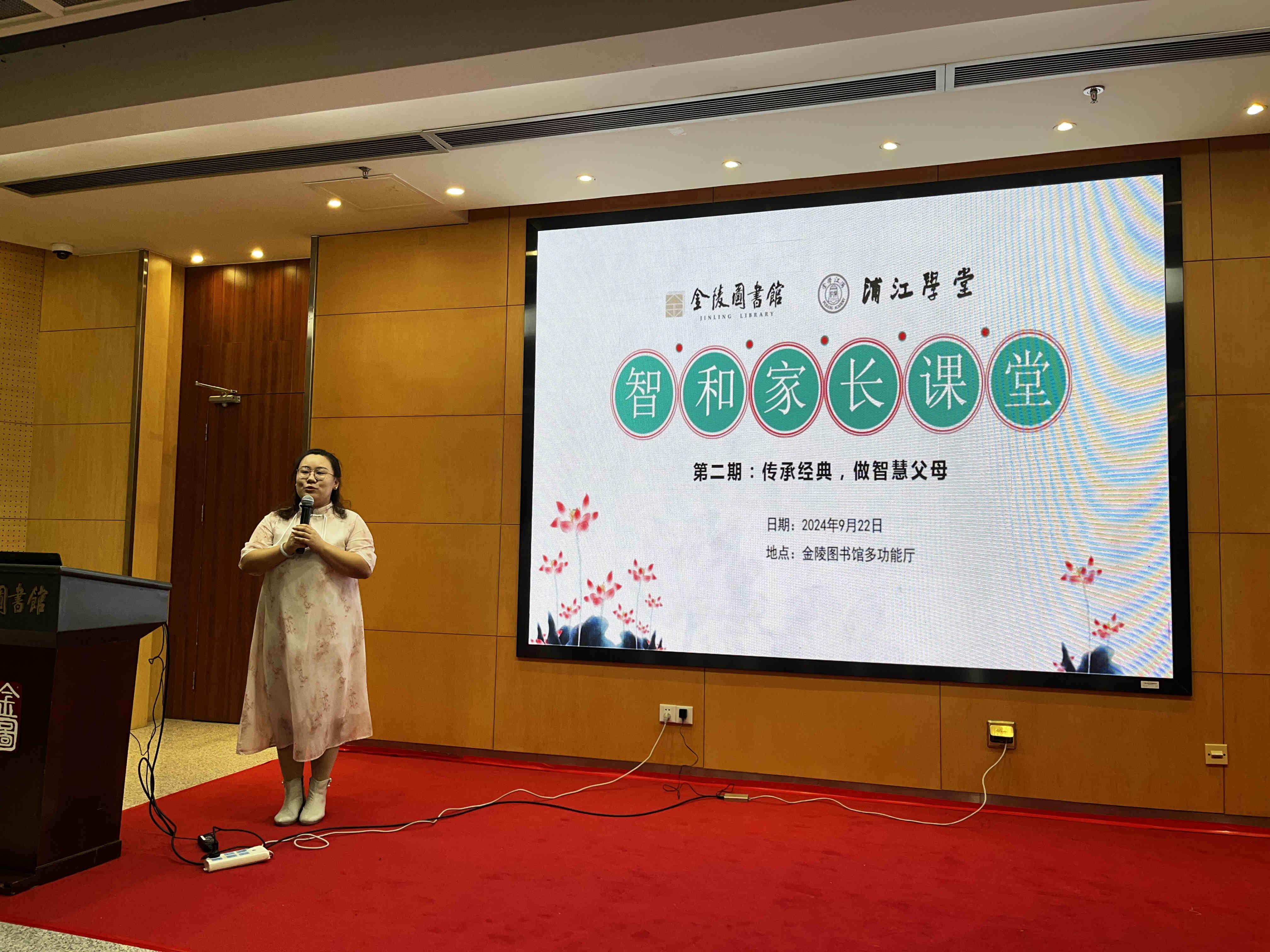 9月22日上午,一场别开生面的家长课堂在金陵图书馆多功能厅举办。金图智和家长课堂是由金陵图书馆主办,以金陵·浦江学堂智和班的家长和班主任为活动主讲,面向全市读者的阅读推广系列活动,家长课堂包括了中华优秀传统文化、亲子教育、心理讲座、好书推荐、读书沙龙等主题,通过这样的活动,在静读和交流中感受圣人的智慧,不断提升南京市民的文化素养,同时就育儿问题共同探讨,互相学习,为家长们自我成长,更好地陪伴孩子提供了支持。