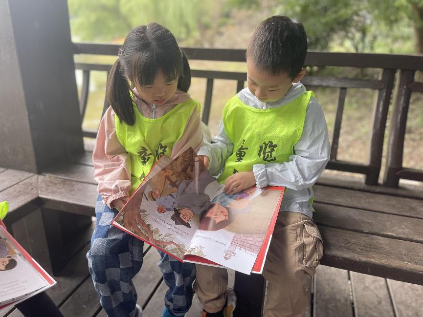 随后,老师带领大家在一处凉亭里开始共读环节。恰逢国庆节来临之际,本次活动挑选的共读绘本是爱国主义故事《小萝卜头》,该书主要讲述了“小萝卜头”宋振中的感人事迹。宋振中是中国年龄最小的革命烈士,他刚出生不久便因父母都是共产党员而遭受敌人的迫害,被带进了监狱。在敌人的监狱里,他度过了短暂而不平凡的一生,年仅8岁便英勇牺牲。这本书以图画书的形式呈现了红色经典故事,令孩子们在阅读的过程中能够更加直观地了解历史、感受革命精神。