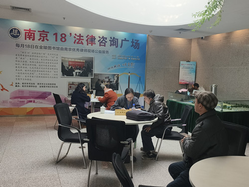 “南京18’法律咨询广场”起始于1994年12月18日,由金陵图书馆与南京市司法局、市律师协会共同创建,是一项常年面向所有市民的公益法律咨询服务。每月18日上午,南京市律师协会从全市各律师事务所选派优秀律师前来义务驻点,解答市民提出的法律问题。