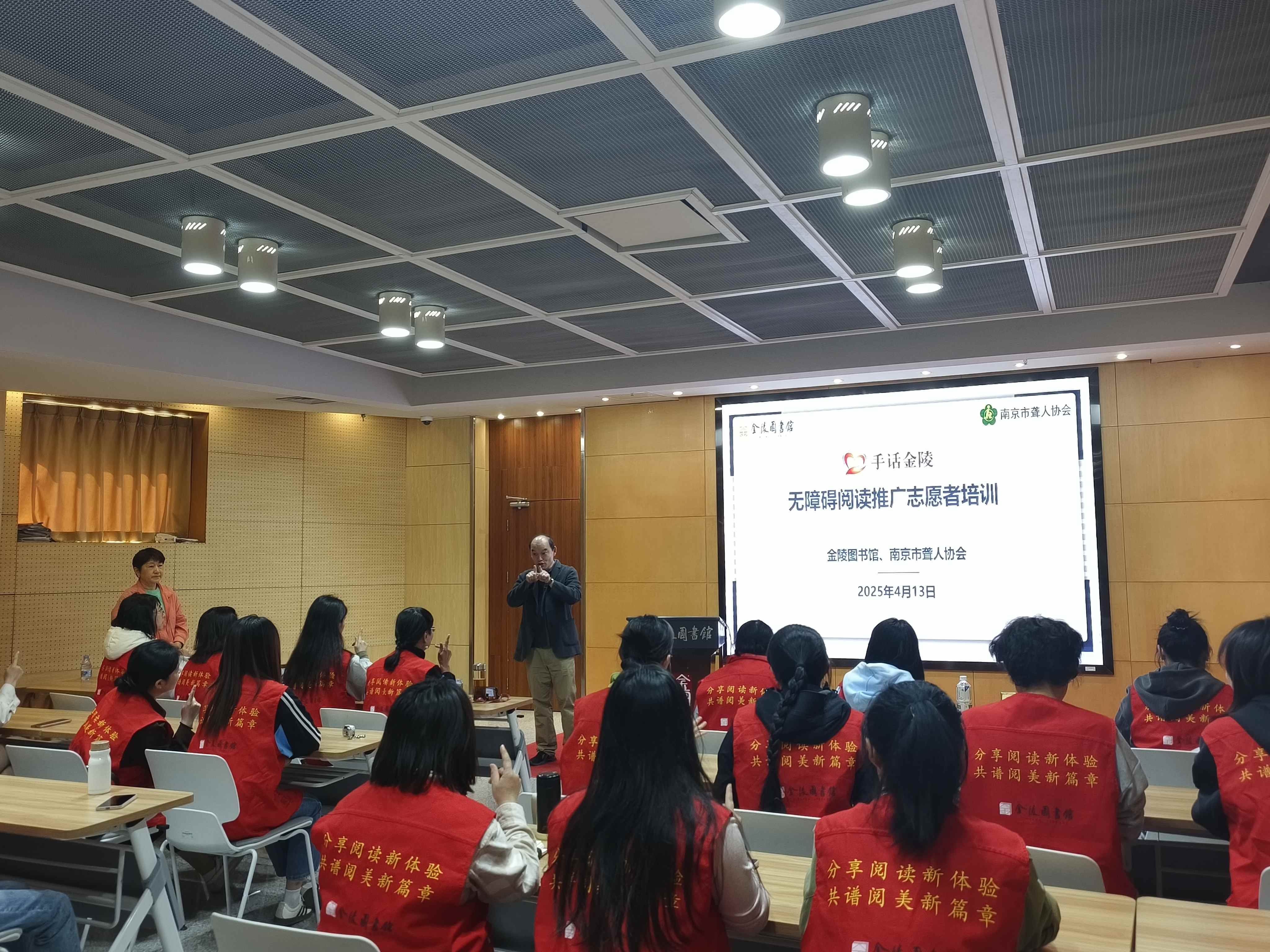 2025年4月13日,由金陵图书馆和南京市聋人协会主办、南京市残疾人联合会支持的“手话金陵”无障碍阅读推广志愿者培训在金陵图书馆举办。