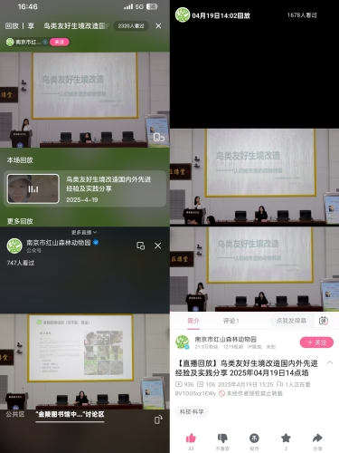 4月19日下午,由南京市红山森林动物园、金陵图书馆、南京晓庄学院图书馆联合主办的2025江苏省暨南京市爱鸟周活动暨“科学的南京”第五季系列活动在南京晓庄学院图书馆正式启动。首场讲座“科学的南京:鸟类友好生境改造”吸引了391名大学生现场参与,并通过南京市红山森林动物园视频号、抖音、小红书、B站等平台同步直播,线上观看人次达5681人。