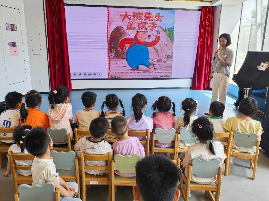 “大熊先生的熊掌虽然圆乎乎,却能精准丈量木料的纹路;叮叮当当的敲打声里,藏着对房屋温度的执着追求……”在杨新老师温润的讲述中,孩子们跟随绘本《大熊先生盖房子》走进森林建筑师的世界。故事里,大熊先生面对歪斜的树干不气馁,用三角支撑法让房屋稳如磐石;为让小鸟安家,特意在屋檐预留栖息处。这些充满巧思的细节,让“劳动创造美”的种子悄然扎根在孩子们心间。