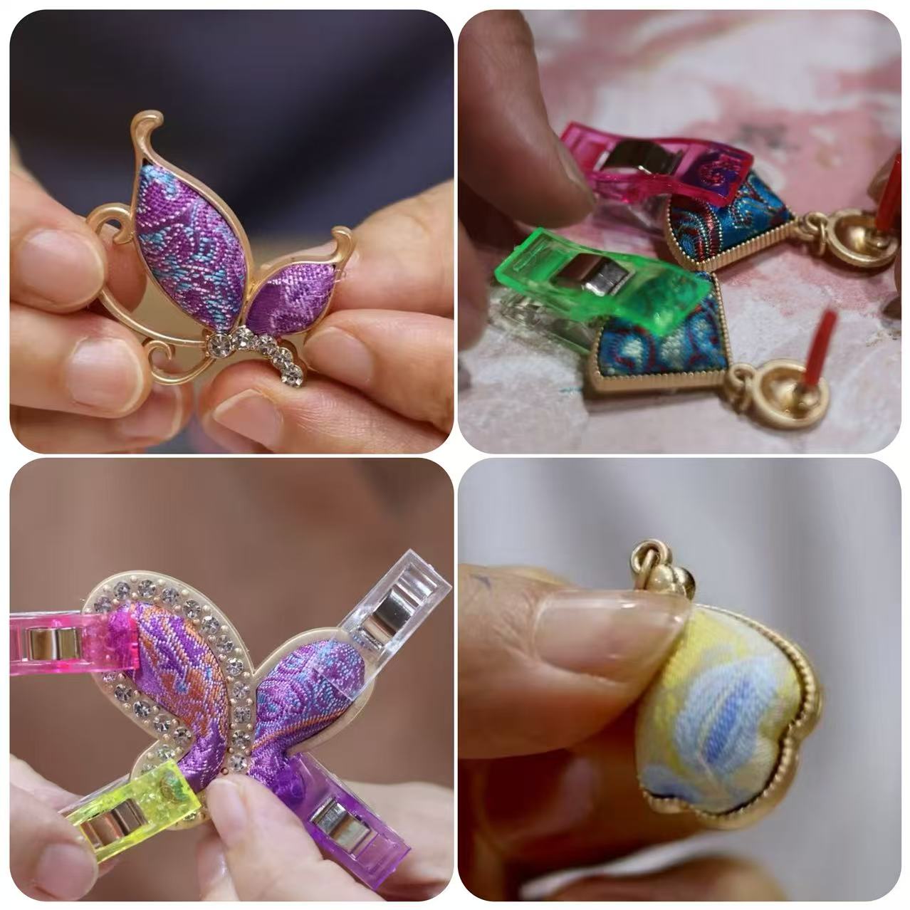 讲解结束后,宋锦手作实践正式开始。在袁慧老师细致的指导下,家长们从华丽的宋锦布料中挑选出心仪的纹样,精心裁剪出对应饰品的独特形状,再有条不紊地穿针引线进行上料等工序。现场一片静谧专注,大家都沉浸在宋锦缝制中,那一片片边角碎料,逐渐蜕变为精美的发饰、雅致的胸针等饰品。当成品诞生的那一刻,大家的脸上洋溢着自豪与喜悦,纷纷拍照留念,分享这份独特的创作成果。